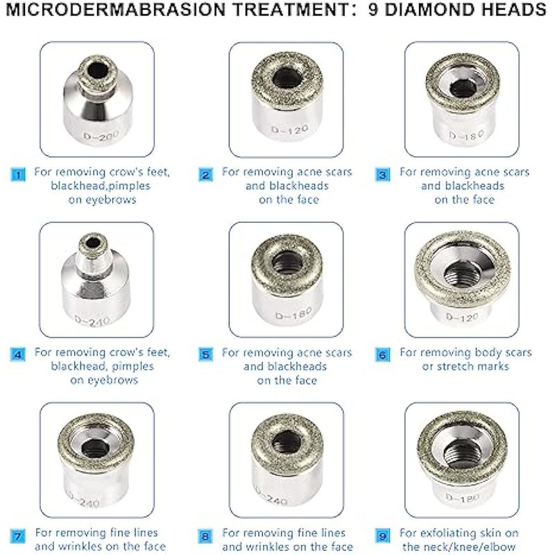 Función 1: 9 cabezas de diamante: elimina residuos, cicatrices, imperfecciones, arrugas y pigmentación desigual en la piel