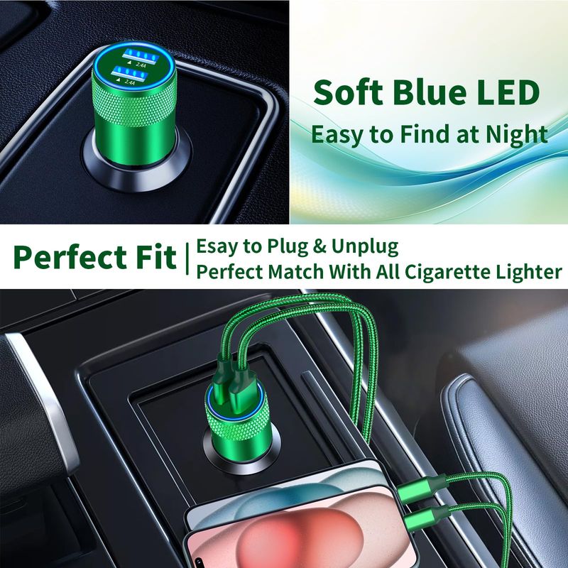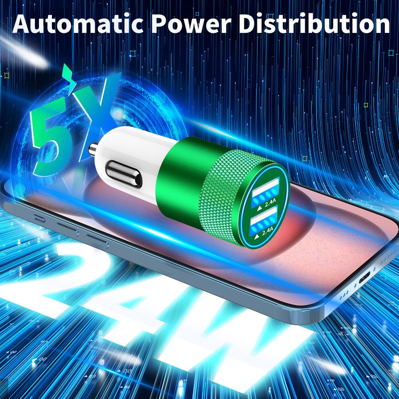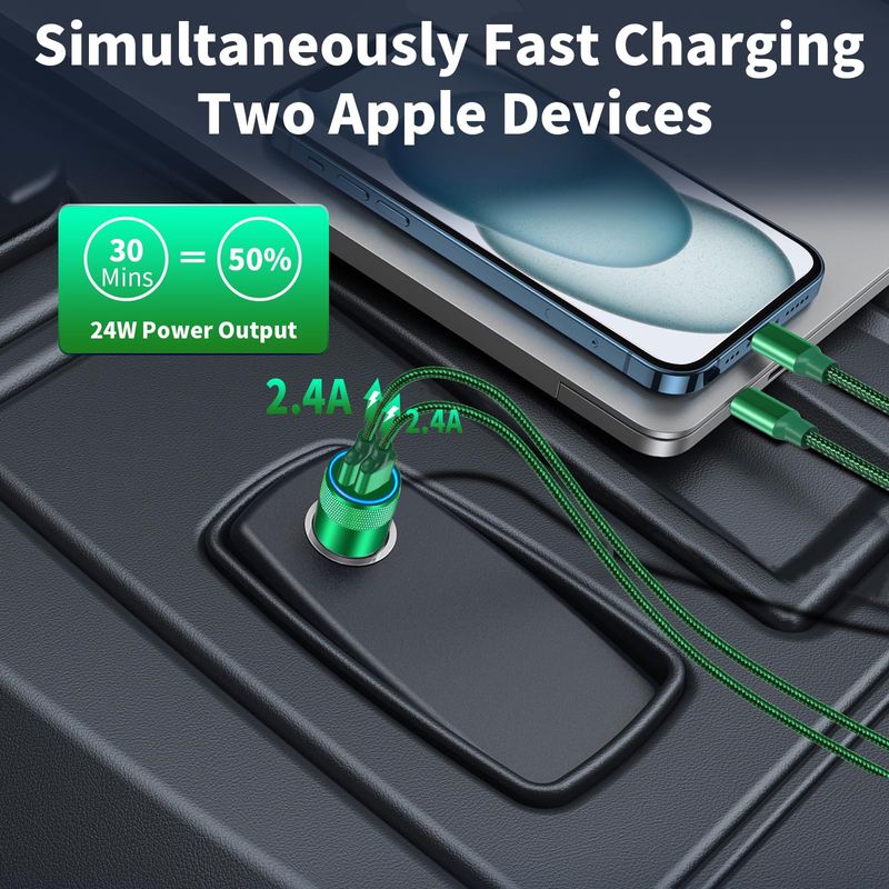 1. Charging two devices simultaneously with this incredibly powerful 24W dual USB car fast charger to match your iPhone device's need.