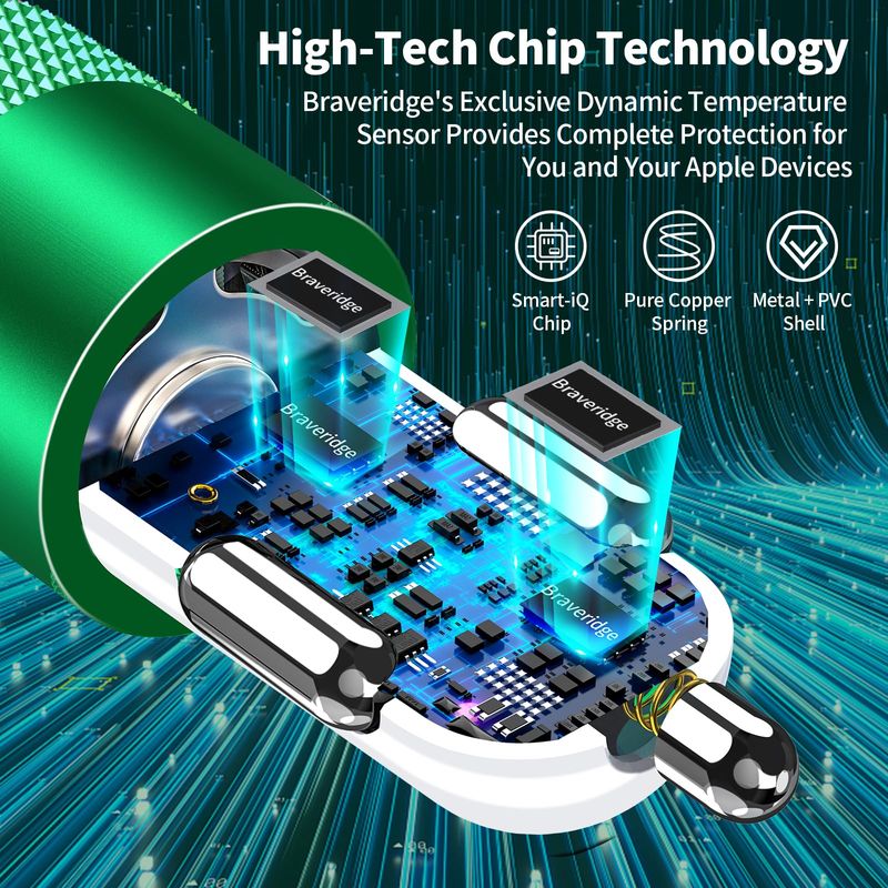 ?Intelligent Protection Technology?: Braveridge's 24W Dual USB Power Fast Car Charger adopt to the latest Intelligent temperature control system can auto-detect iPhone device connected in lightning port, while also identifying the appropriate current to charge optimally at their fully intended speeds up to a total of 4.8A and guarantee your iPhone devices are charging at their maximum speed, the sophisticated protection measures to ensure safety for you and your iPhoneiPad.