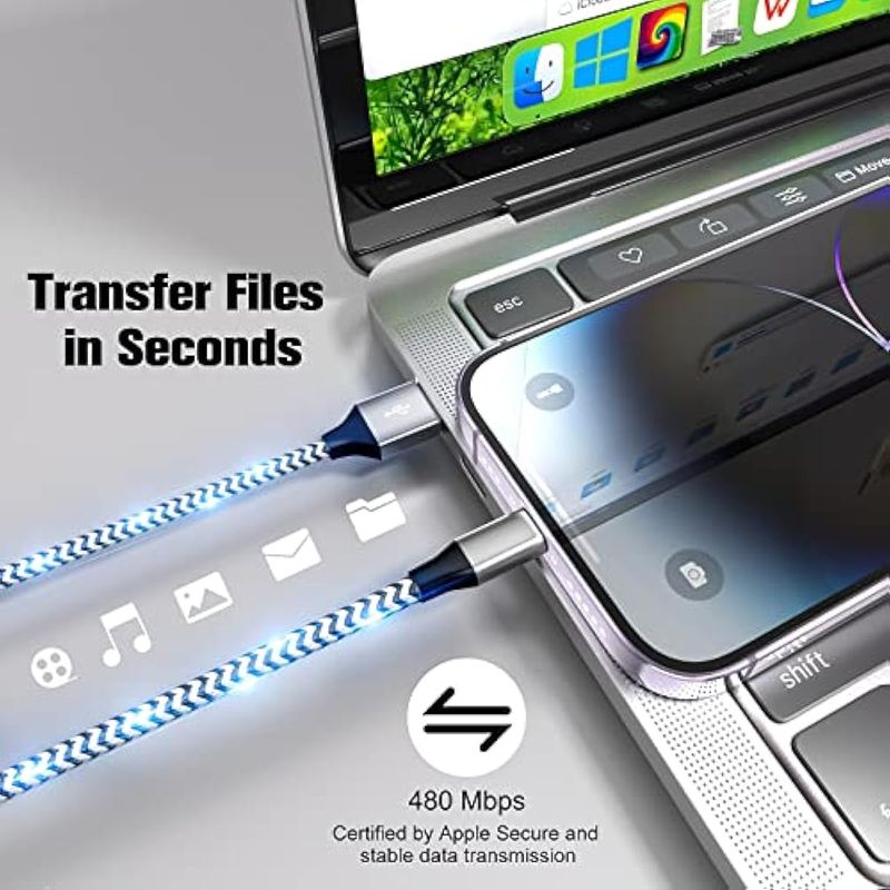 Carga rápida y sincronización de datos: con el último chip original y cable de cobre grueso de alta calidad, logra una carga rápida sin dañar tu teléfono, un 25 más rápido que los cables normales, y soporta velocidad de transferencia de datos de hasta 480 Mbps, puedes transferir fácilmente archivos, música y fotos entre iPhone y Macbook en segundos.