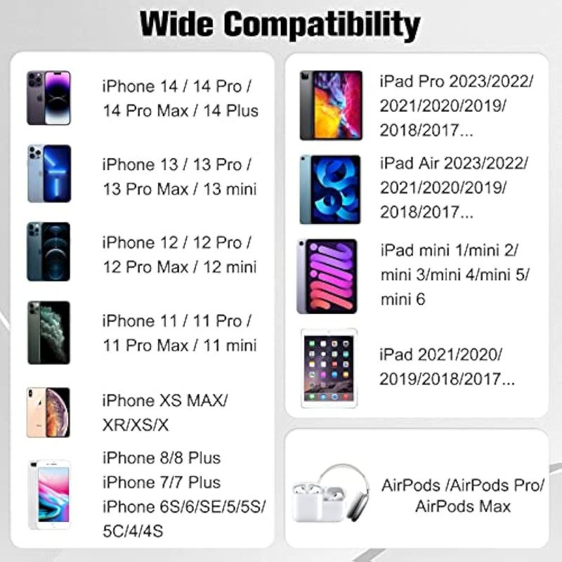 Compatibilidad: el cable USB a iPhone con certificación MFi soporta Apple 14, 13, 12, 11, XS, XR, X, 8Plus, carga rápida 8, Apple 7,6. carga normal. Y compatible con iPad, ipod touch series.