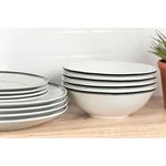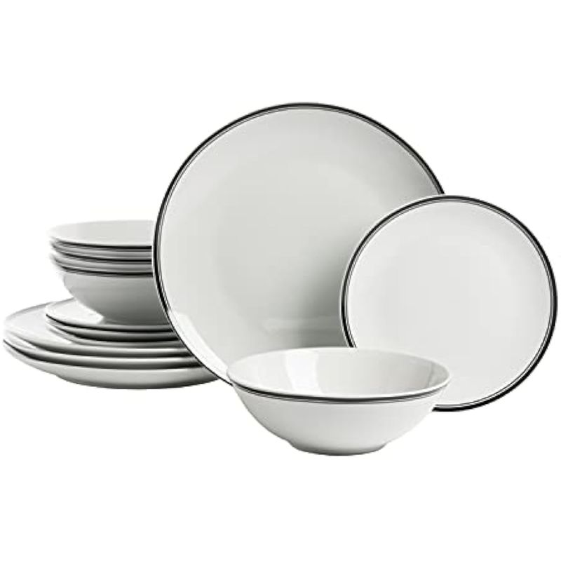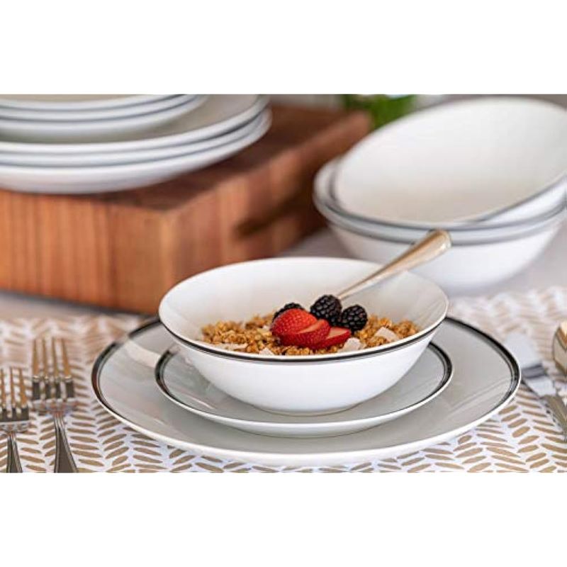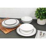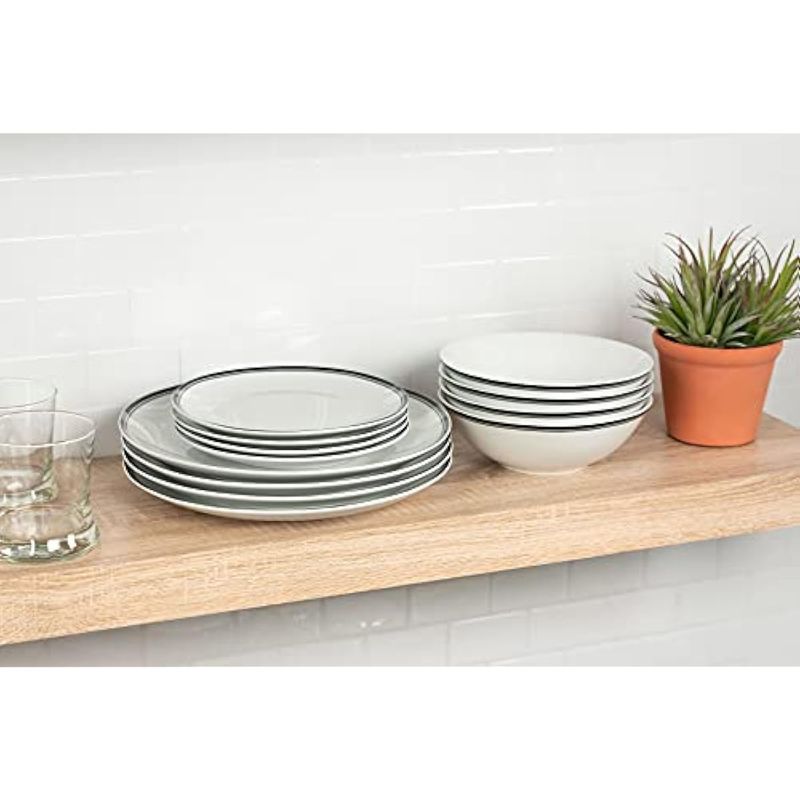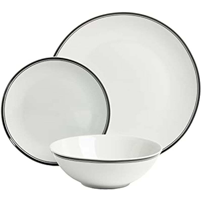 Clásica, limpia y duradera, la colección Cafe Stripe tiene una forma sin costuras y una calcomanía de borde de doble banda en una variedad de tonos elegantes. Fabricados con cerámica apta para horno a mesa, microondas y lavavajillas, estos platos serán tu favorito para el desayuno, el almuerzo, la cena y los aperitivos en el medio. Servicio para cuatro este juego incluye: 4 platos llanos, 4 platos de ensalada y 4 tazones de sopa.