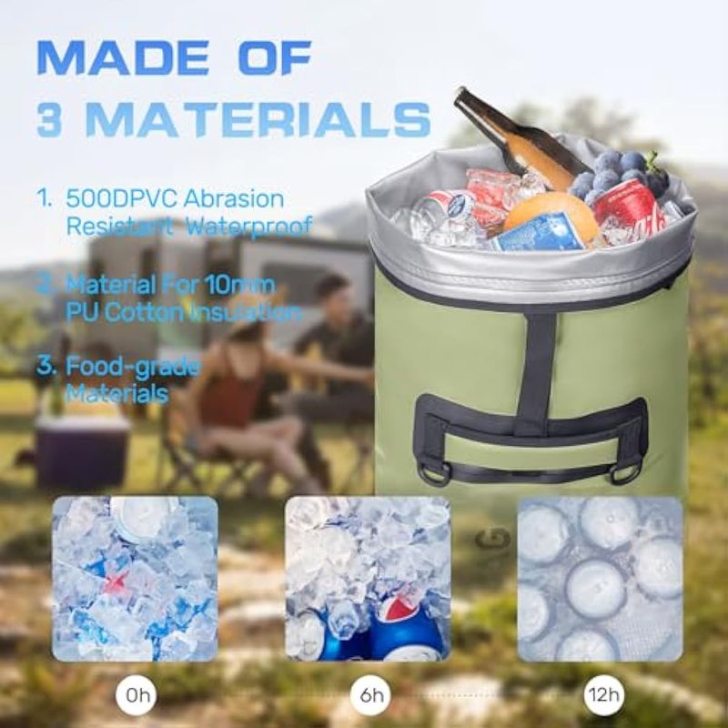 Mochila térmica aislada a prueba de fugas: la mochila enfriadora aislada a prueba de fugas, la superficie está hecha de PVC de 500 DC, lo que hace que la superficie sea impermeable, el interior está hecho de algodón de 0.394 in para garantizar que las bolsas más frías estén aisladas a prueba de fugas. Mochila térmica aislada impermeable, puede contener una variedad de alimentos y puede preservar una temperatura constante hasta 24 horas cuando está llena de hielo.