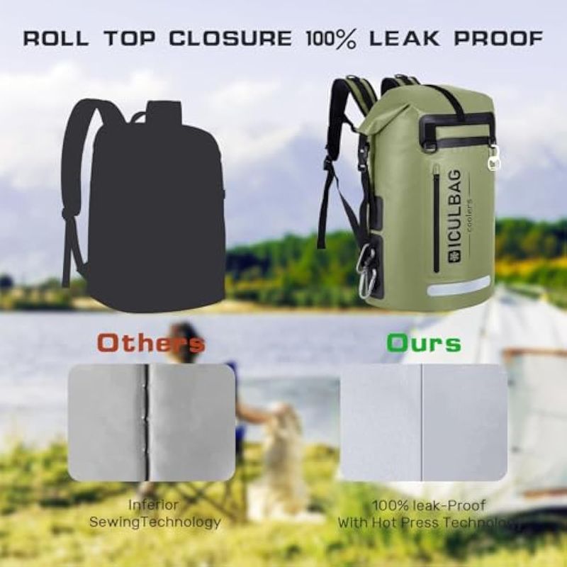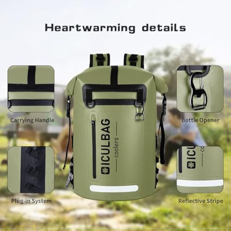 Enfriador de mochila impermeable Cómo usar: las bolsas enfriadoras de gran capacidad aisladas, pueden contener el almuerzo para 4-5 personas. Solo tienes que abrir el bolsillo principal de la mochila de refrigeración suave, poner alimentos, frutas, bebidas y hielo, luego enróllala tres veces, cierra el pestillo y estarás listo para viajar con tu bolsa de refrigeración. Si tienes algún problema con tu mochila refrigeradora, puedes dejar un mensaje a Iculbag a través de Amazon y te resolveremos el problema lo antes posible.