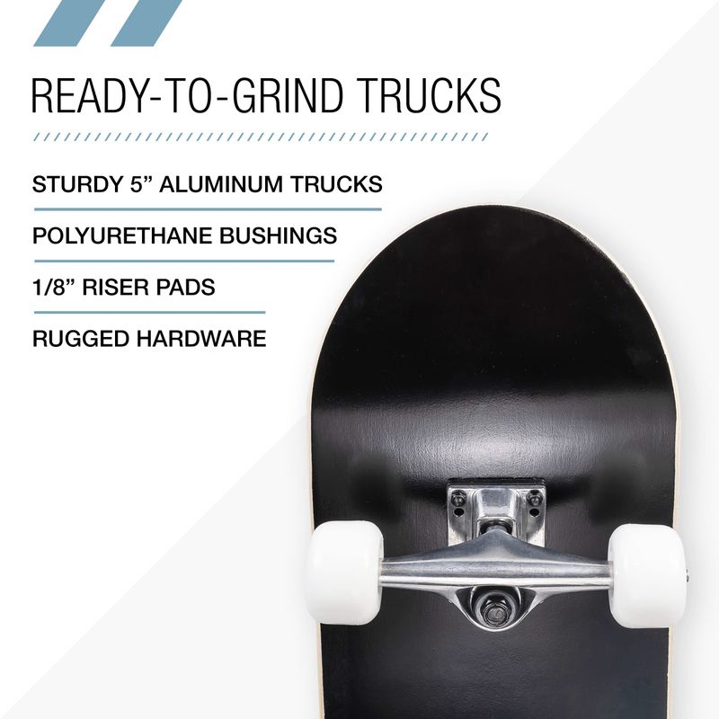 CAMIONES LISTOS PARA MOLIZAR: Camiones de aluminio resistentes de 5 "con bujes de poliuretano de alto rebote, almohadillas elevadoras de 18" y hardware resistente para proporcionar una sensación y control sólidos de la tabla.