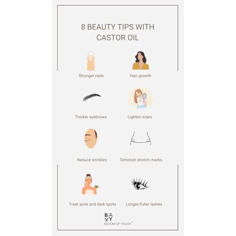 Respetuoso con el medio ambiente: el aceite de ricino Bloom of Youth no contiene hexano, prensado en frío, libre de crueldad, vegano, probado por terceros y sin aditivos ni fragancias.
