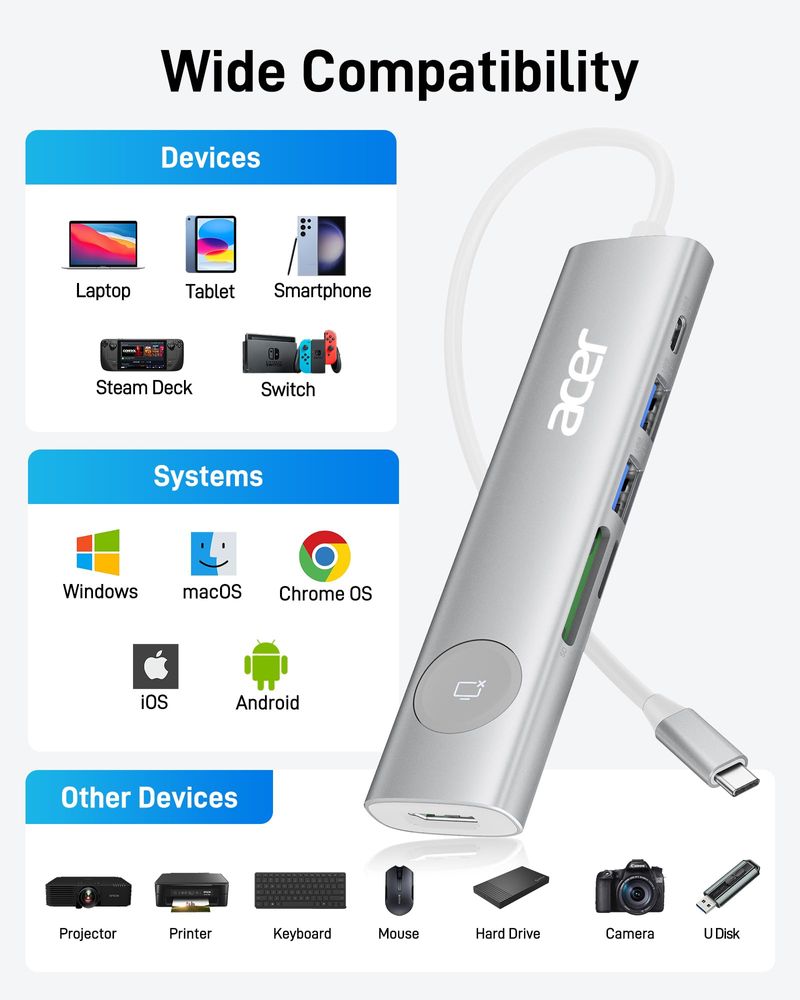 El dongle Acer USBC está hecho de material de aluminio, expande un solo puerto USB-C a 7 puertos 1 HDMI 4K a 60 HZ, 2 USB 3.1, 1 USB-C, 1 carga PD tipo C, 1 ranura para tarjeta MicroSD, 1 ranura para tarjeta SD. Amplía tu trabajo desde casa, oficina o sobre la marcha.