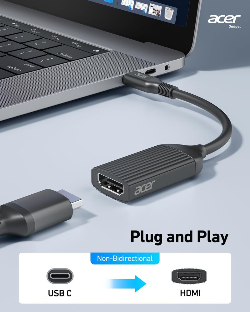 Ultra HD 4K a 60 Hz: el adaptador USB C a HDMI de Acer soporta resoluciones de hasta 4K @60Hz y es retrocompatible con 2K @144 Hz60 Hz, lo que puede evitar la fatiga visual causada por una baja frecuencia de actualización. Nota: ?Solo admite transmisión unidireccional USB-C a HDMI; ? No admite carga