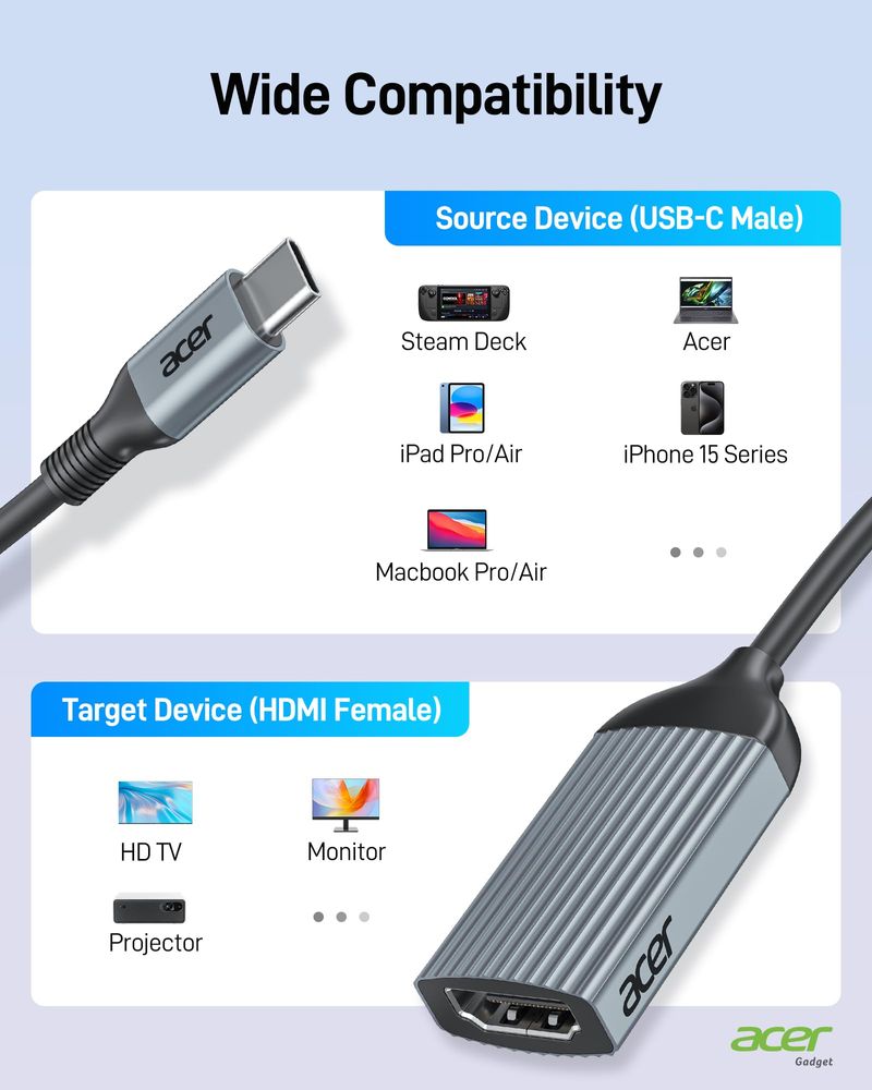 Ultra HD 4K a 60 Hz: el adaptador USB C a HDMI de Acer soporta resoluciones de hasta 4K @60Hz y es retrocompatible con 2K @144 Hz60 Hz, lo que puede evitar la fatiga visual causada por una baja frecuencia de actualización. Nota: ?Solo admite transmisión unidireccional USB-C a HDMI; ? No admite carga