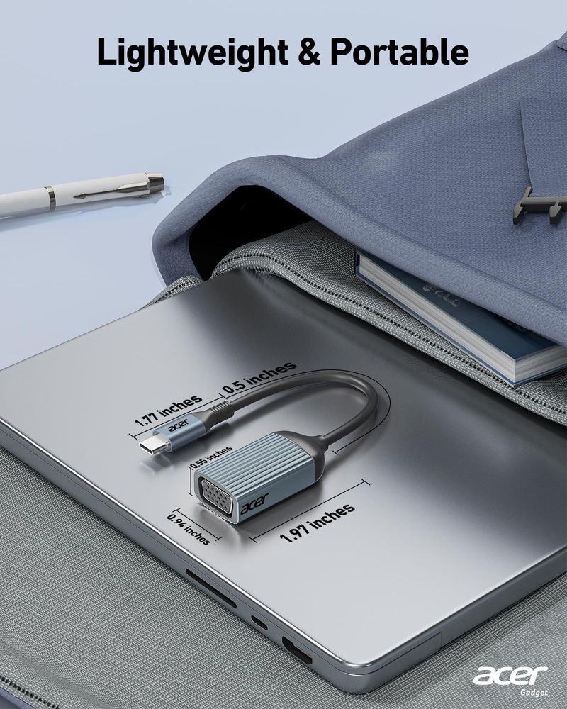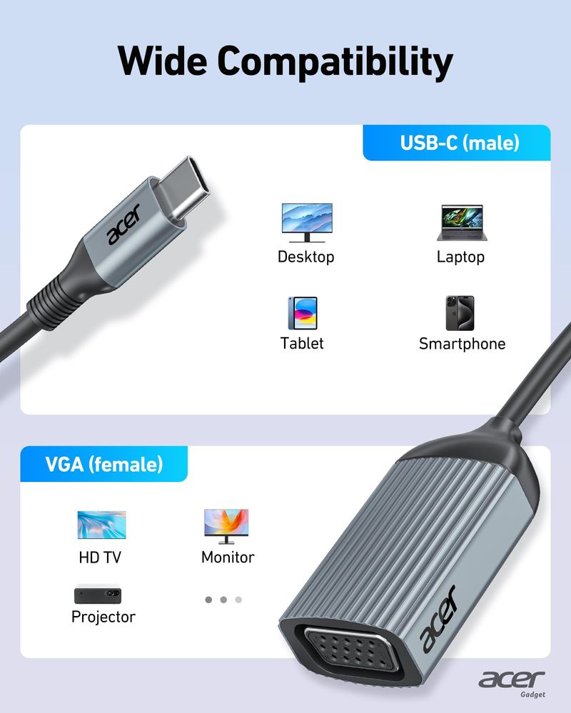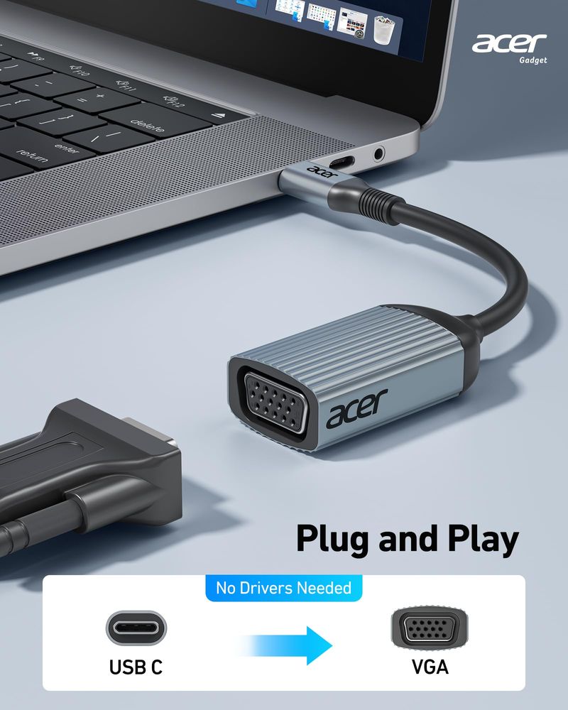 acer Adaptador USB C a VGA, Thunderbolt 3/4 a VGA, carcasa de aluminio, compatible con iPhone 15/16,