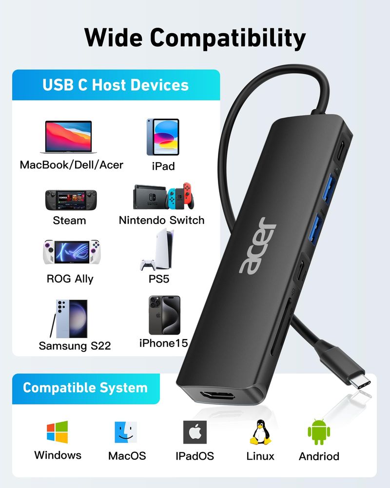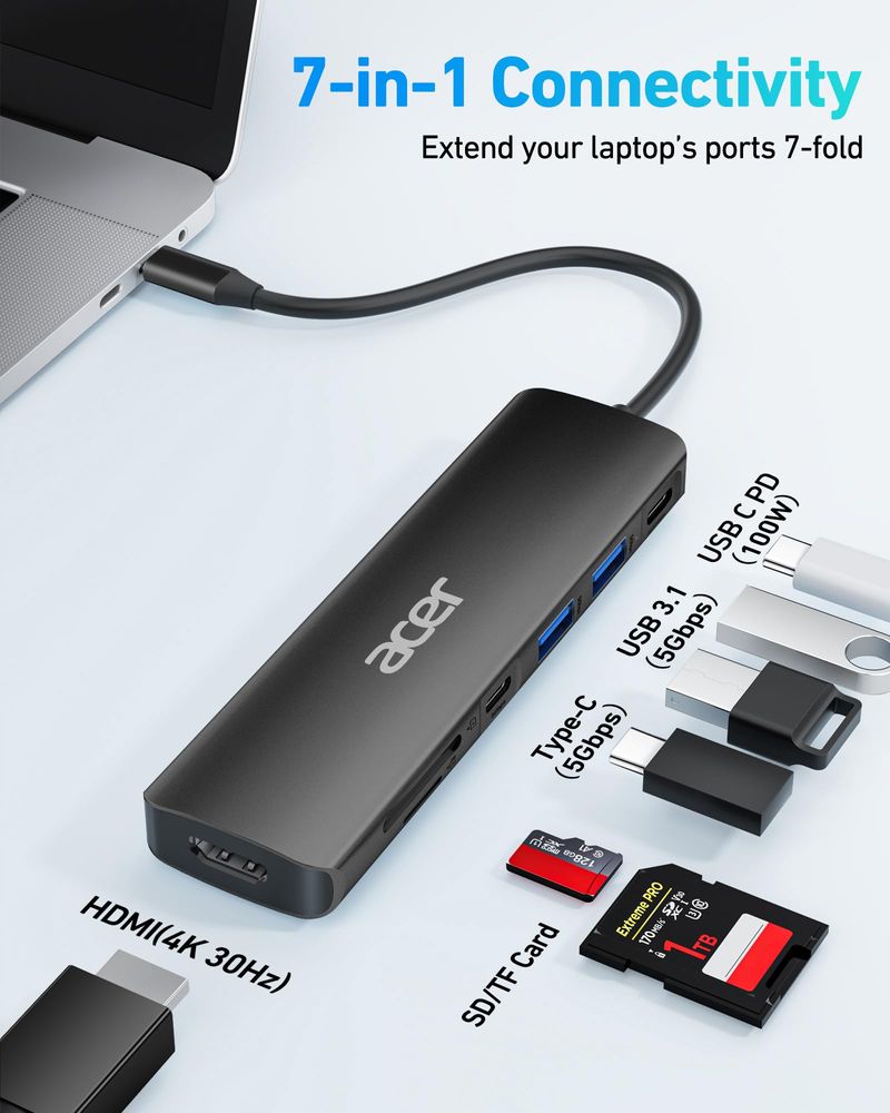 Acer Hub USB C, 7 en 1 USB C a base HDMI, 2 puertos USB 3.1 GEN1 y 5Gbps tipo C, puerto HDMI 4K,