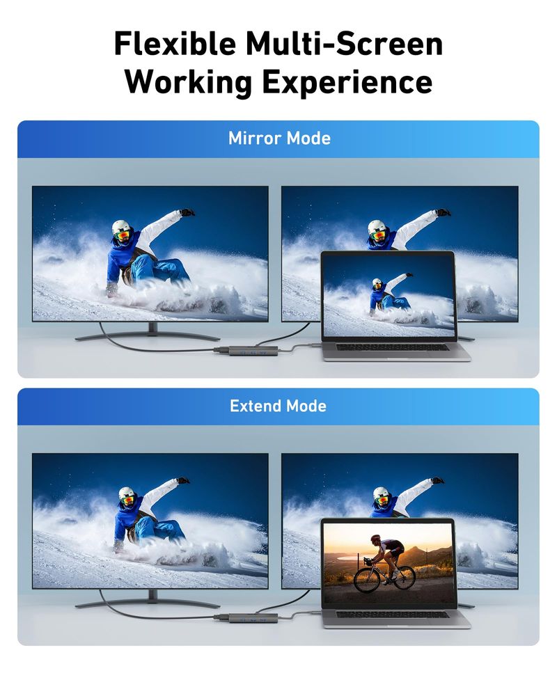 [Amplía tus opciones de pantalla] La base USB permite la funcionalidad de doble pantalla para tu laptop al conectarse simultáneamente a VGA y HDMI. Ofrece modos MIRROR y EXTEND, mejorando la eficiencia de tu trabajo. Cuando se conectan 2 monitores a través de HDMI y VGA en modo extendido, las 2 pantallas externas solo mostrarán el mismo contenido