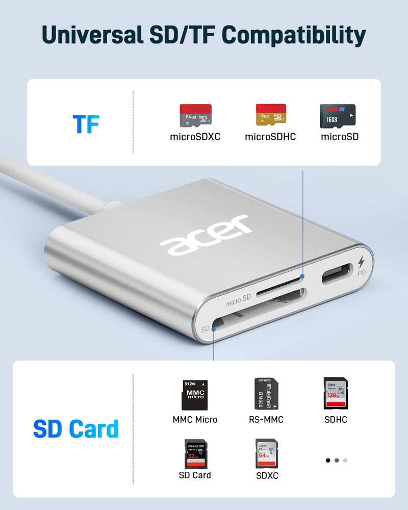 ACER LECTOR DE TARJETAS SD 4.0, LECTOR MICRO SD UHS-II USB C, ADAPTADOR DE TARJETA DE MEMORIA TIPO C DE DOBLE RANURA CON PUERTO PD DE 100 W PARA MICROSD SDXC SDHC UHS-II Y UHS-I PARA IPHONE 15/16