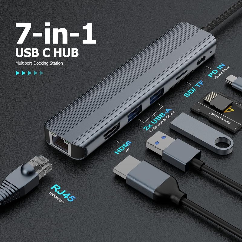 Hub USB-C todo en uno: este concentrador USB-C 7 en 1 cuenta con un puerto HDMI 4K, carga PD de 100 W, dos puertos USB 3.0, lector de tarjetas SDTF y un puerto Ethernet, por lo que es el compañero perfecto para tu MacBook Pro, MacBook Air, Dell XPS y Surface Pro.