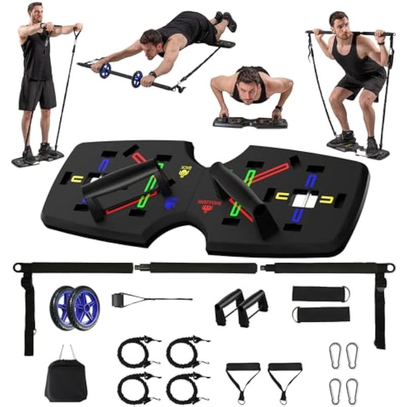 ????Equipo de fitness versátil: equipado con equipos como bandas de resistencia y rodillos abdominales, nuestras tablas de flexión proporcionan una experiencia de entrenamiento integral que se dirige a múltiples grupos musculares. Ya sea que estés buscando fortalecer la parte superior de tu cuerpo, tonificar tu núcleo o mejorar la flexibilidad, este conjunto de fitness todo en uno te tiene cubierto.