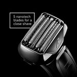 Cuchillas de afeitar afiladas para hombre: La afeitadora eléctrica Panasonic Arc5 para hombre tiene cinco cuchillas nanotecnológicas de 30° ultrafiladas con precisión y una lámina Arc ultrafina que siguen los contornos del rostro para lograr un afeitado rápido, al ras y cómodo.