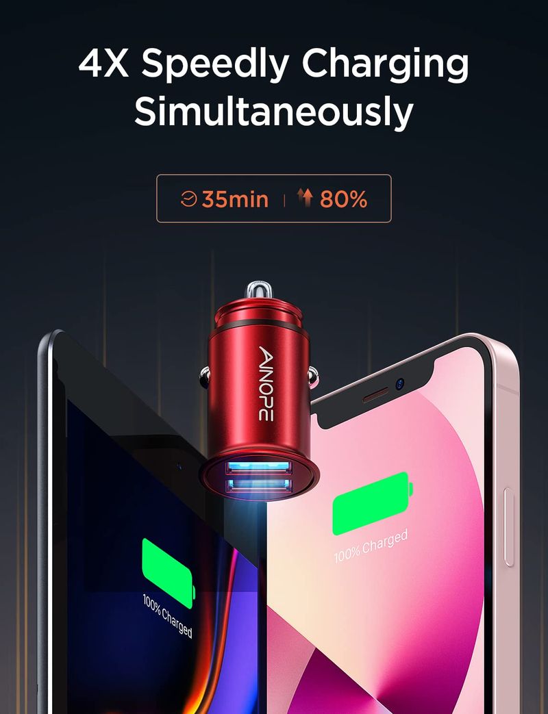 Carga eficiente de 4.8 A24 W: el cargador de automóvil AINOPE puede alcanzar una salida máxima de 2.4A12W por puerto, que la velocidad de carga es 2 veces más rápida que 1A5W. Con una potencia total de 4.8 A, este adaptador de encendedor de cigarrillos USB dual te permite cargar dos dispositivos simultáneamente a toda velocidad con 2.4 A por puerto USB. Nota: no es compatible con Qualcomm Quick Charge. La página de carga no mostrará carga rápida cuando se carga.