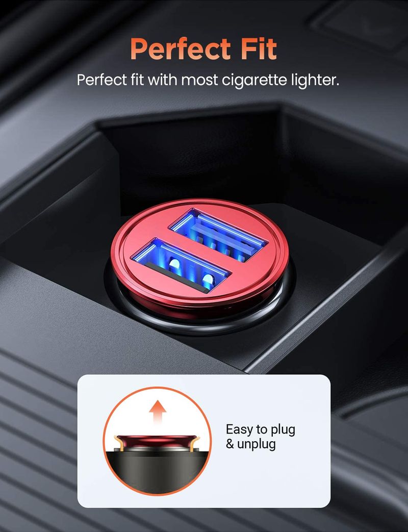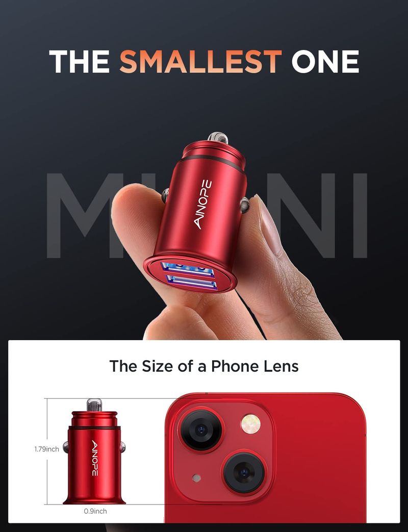 Tamaño compacto, ajuste al bordo: el cuerpo pequeño del tamaño del pulgar 1.7 pulgadas de largo x 0.9 pulgadas de ancho se adapta a la mayoría de los encendedores de cigarrillos de automóviles y apenas sobresale más allá del borde de la salida, proporcionando un aspecto menos desordenado. Es nuestro cargador de coche más pequeño hasta la fecha: ligero y altamente portátil, por lo que puedes llevarlo a todas partes.