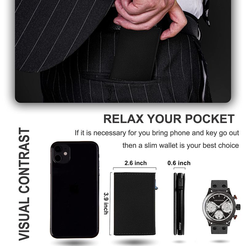 Cierre magnético: el tarjetero está hecho de caja de aleación de aluminio de alta calidad + cuero de alta calidad, con 4 imanes fuertes, mejor que el tarjetero normal, por lo que el tarjetero no se abra cuando está cerrado. La cartera ultrafina está diseñada para caber directamente en el bolsillo para un fácil transporte, y la cartera de cuero se puede utilizar para almacenar dinero en efectivo.