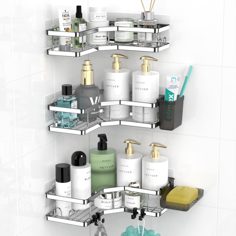 AKTECKE Organizador de esquina para ducha, paquete de 2 estantes organizadores adhesivos de ducha,