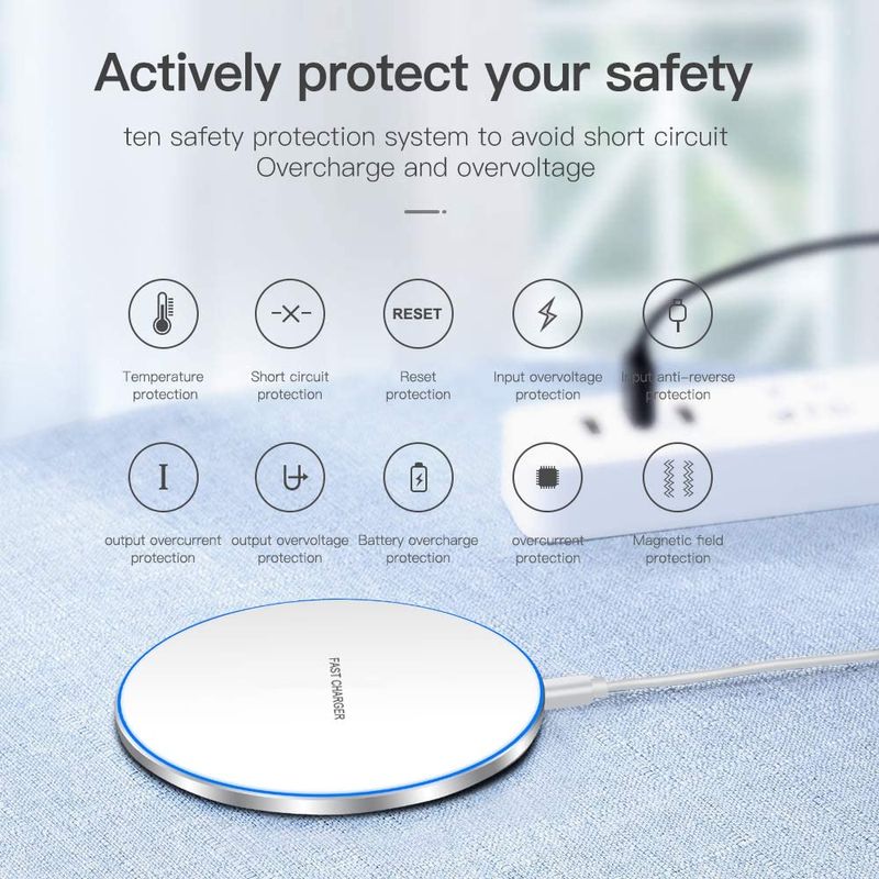 Delgado y seguro: mide 0.256 in de grosor y 3.858 in de ancho, este cargador inalámbrico tiene un panel minimalista duradero y elegante y un elegante diseño de marco de metal que es fácil de transportar. Hay 4 almohadillas antideslizantes en la parte inferior, se mantendrán estabilizadas. Exclusiva tecnología multifuncional de protección inteligente que proporciona protección contra sobrecorriente, sobretensión, sobretemperatura, cortocircuito y detección de objetos extraños.
