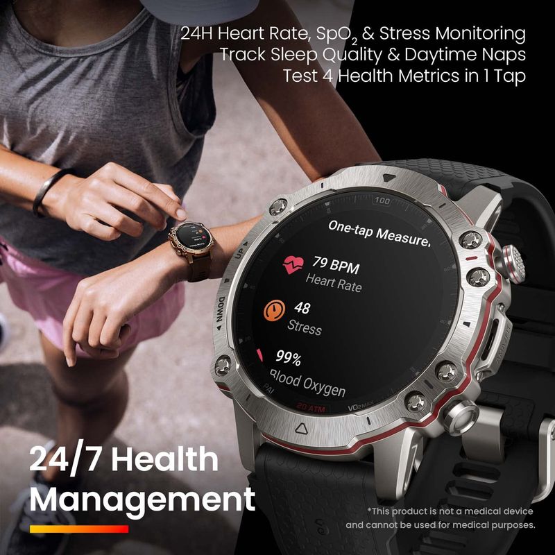 Fácil monitoreo de salud 247: asegúrate de que estás corriendo al máximo rendimiento, vigilando tu frecuencia cardíaca, oxígeno en sangre y nivel de estrés 24 horas al día, así como tu calidad de sueño nocturno y siestas diurnas. Además, soporta pruebas de 4 métricas de salud en un solo toque.