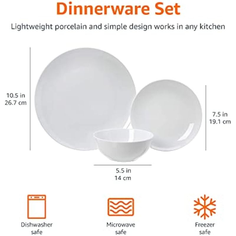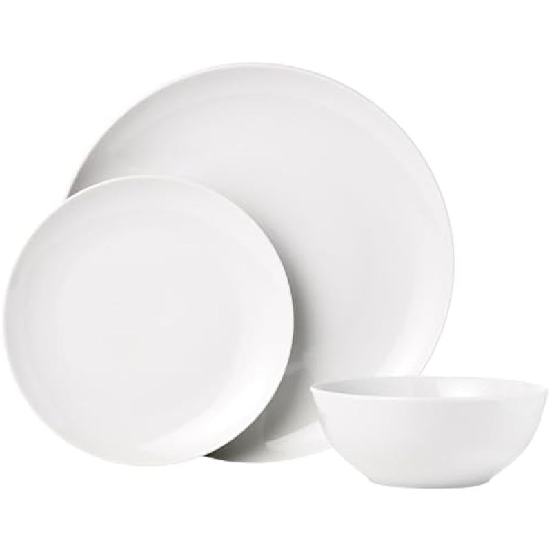 HOGARBAZARUTENSILIOS DE COCINAAmazon Basics - Juego de vajilla de 18 piezas con platos y tazones, servicio para 6 personas, blanco