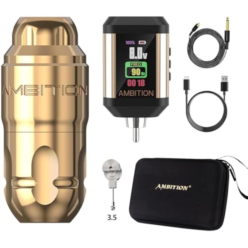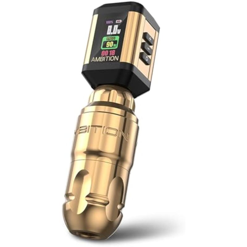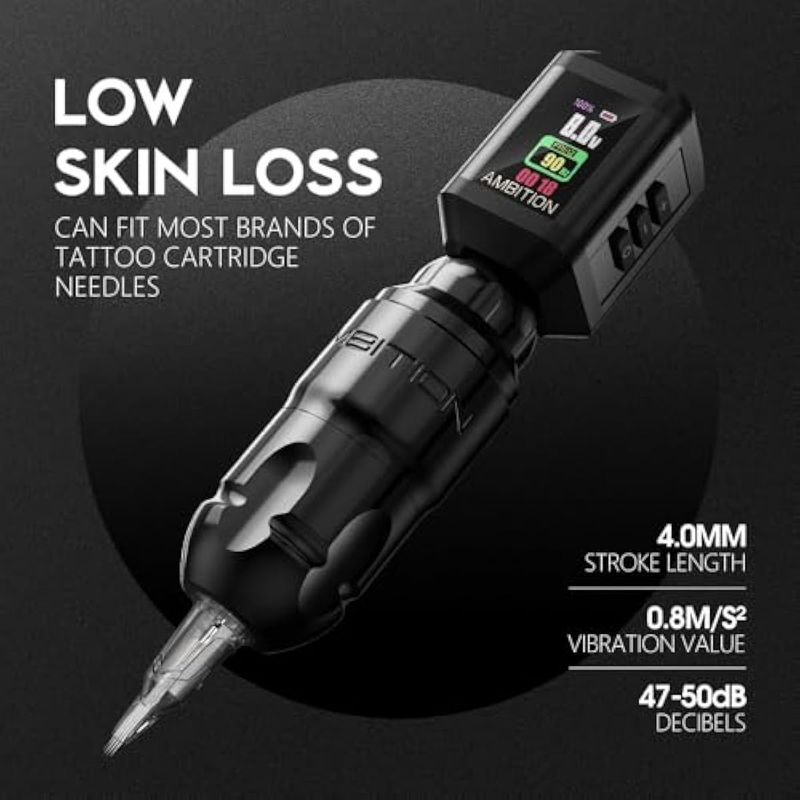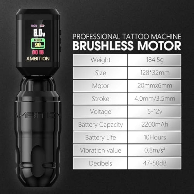 Tamaño: máquina de tatuaje Ambition construida con aluminio de avión para un peso más ligero; fuente de alimentación de tatuaje Ambition hecha de marco de aleación de aluminio y acrílico de alta calidad. Longitud total: 5.039 in5 pulgadas, diámetro: 1.260 in1.25 pulgadas, peso total: 6.51 oz6.5 onzas. Corto y portátil, más ligero y tiene una vibración mínima, le da al tatuador un mejor control y menos fatiga.