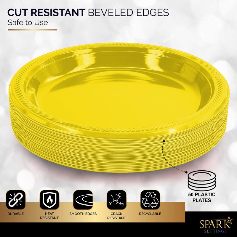 Especificaciones: los platos desechables para fiestas son gruesos impermeables y resistentes al aceite. Los elegantes platos de plástico vienen en 13 colores brillantes y vibrantes, negro, naranja, transparente, lima, morado, blanco, azul, verde, rojo, rosa, oro, burdeos y plata. Los platos llanos de plástico miden 10.4 pulgadas y vienen en un paquete de 50.