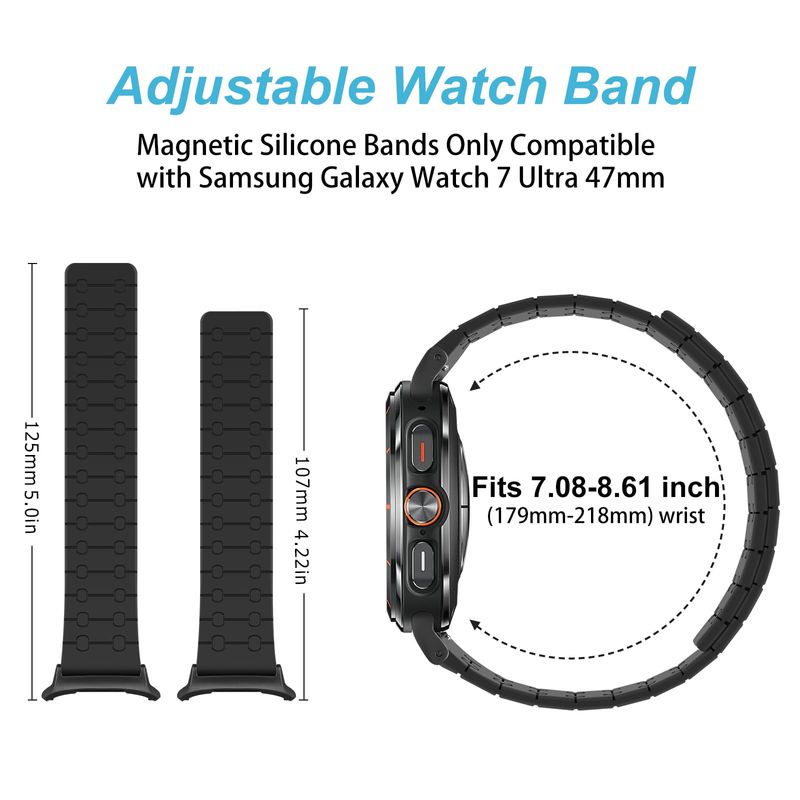 Modelos y tamaños compatibles: correa magnética de silicona Amizee compatible con Samsung Galaxy Watch 7Galaxy Watch 6Galaxy Watch 5Galaxy Watch 4 1.575 in 1.732 inGalaxy Watch FE 1.575 inGalaxy Watch 6 Classic 1.693 in 1.850 in, Galaxy Watch 5 Pro 1.772 in. Se adapta a muñecas de 4.64-7.6 pulgadas 4.449 in-7.598 in. NOTA: Confirma el tamaño comprobando el tamaño en la parte posterior del reloj antes de realizar un pedido.