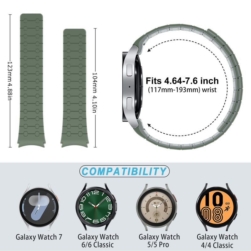 Modelos y tamaños compatibles: correa magnética de silicona Amizee compatible con Samsung Galaxy Watch 7Galaxy Watch 6Galaxy Watch 5Galaxy Watch 4 1.575 in 1.732 inGalaxy Watch FE 1.575 inGalaxy Watch 6 Classic 1.693 in 1.850 in, Galaxy Watch 5 Pro 1.772 in. Se adapta a muñecas de 4.64-7.6 pulgadas 4.449 in-7.598 in. NOTA: Confirma el tamaño comprobando el tamaño en la parte posterior del reloj antes de realizar un pedido.