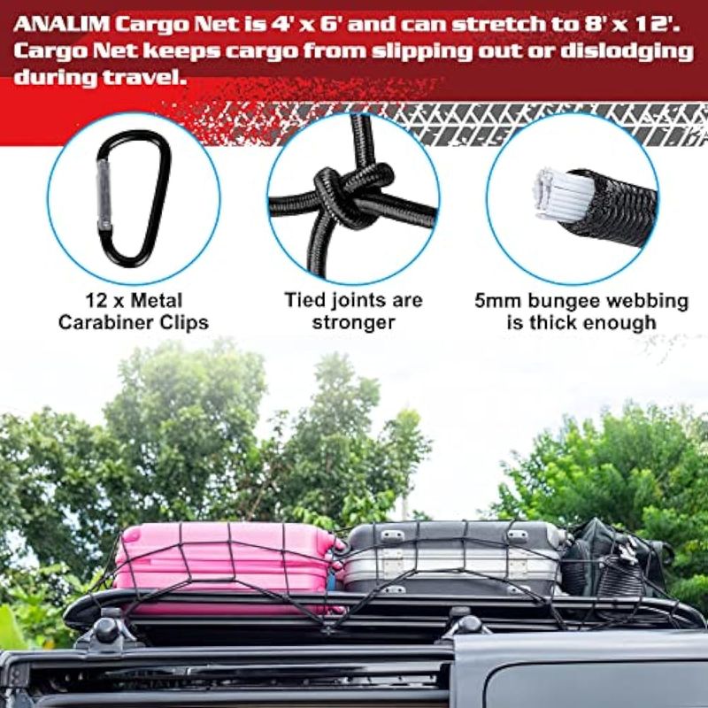 Asegura tu carga: la red de carga ANALIM mide 4 x 6 pies y se puede estirar hasta 8 x 12 pies. El paquete contiene 1 red de carga elástica, 12 clips de mosquetón de metal y 1 bolsa de almacenamiento. La red de carga ANALIM evita que la carga se deslice o se desaloje durante el viaje.