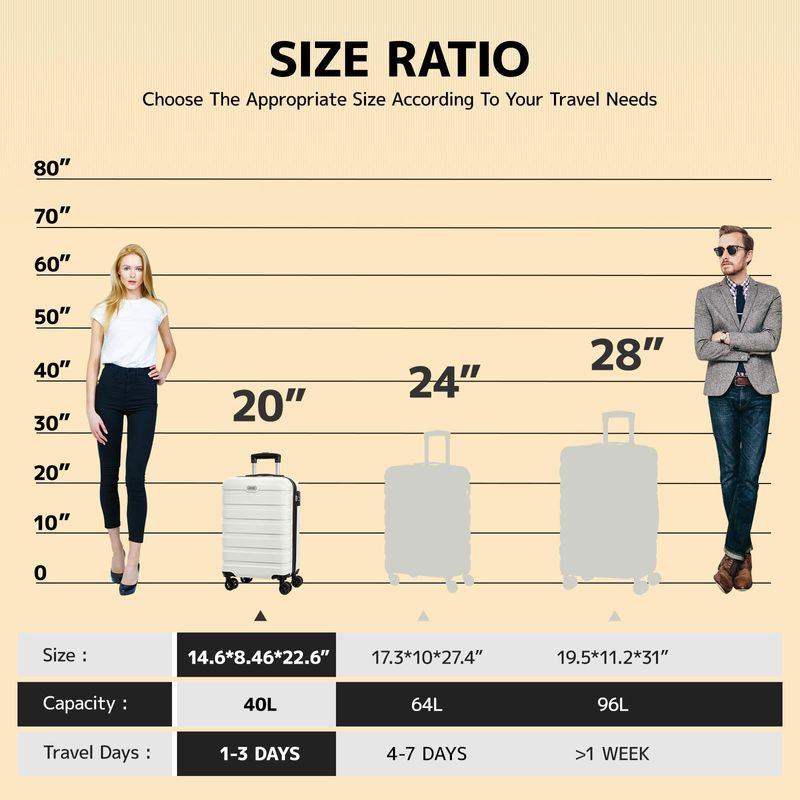 [De mano de 20 pulgadas] La maleta de 20 pulgadas puede cumplir con las funciones de embarque, viajes y almacenamiento diario, y se puede llevar en el avión sin registrarse. Tamaño: 14.6 x 8.46 x 22.6 pulgadas. Capacidad: 40L.