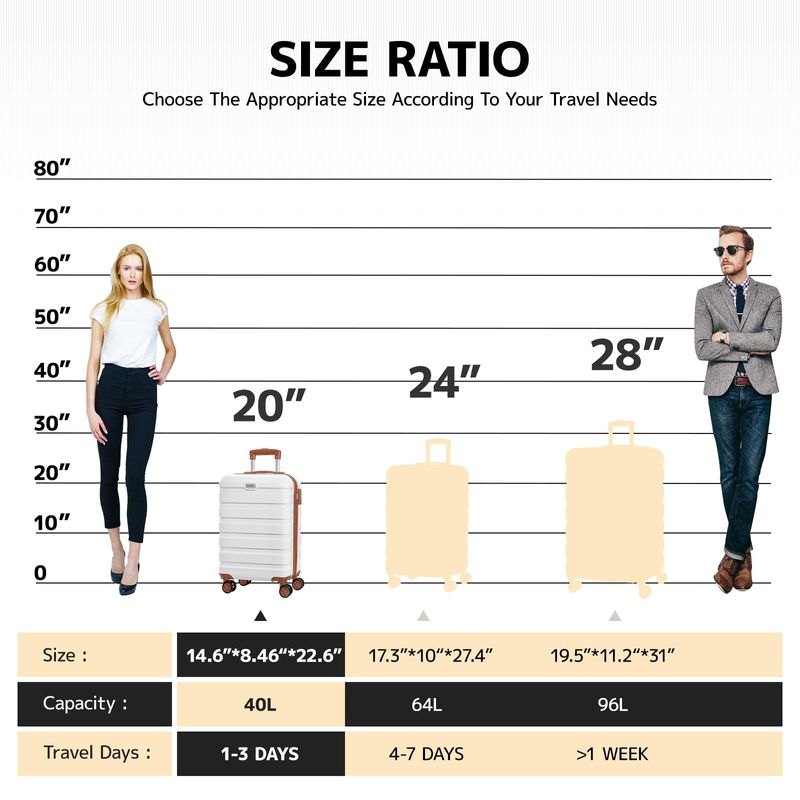 [De mano de 20 pulgadas] La maleta de 20 pulgadas puede cumplir con las funciones de embarque, viajes y almacenamiento diario, y se puede llevar en el avión sin registrarse. Tamaño: 14.6 x 8.46 x 22.6 pulgadas. Capacidad: 40L.