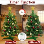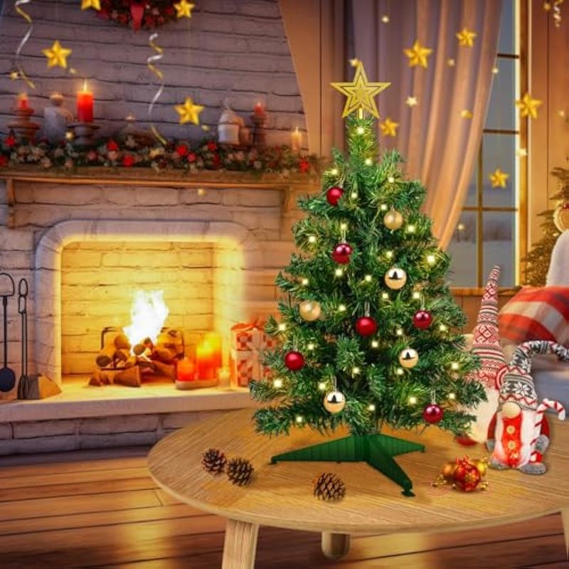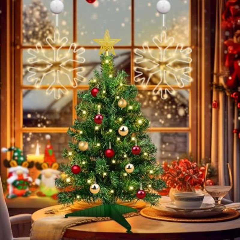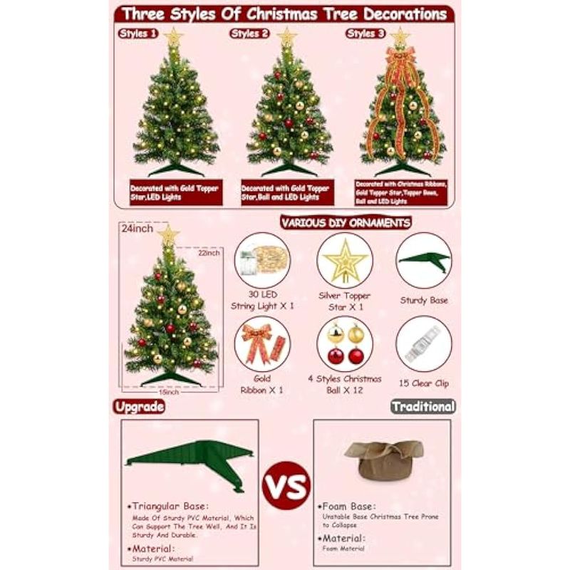 Árbol de Navidad de mesa de 22 pulgadas con temporizador, 30 luces LED cálidas, cinta roja con