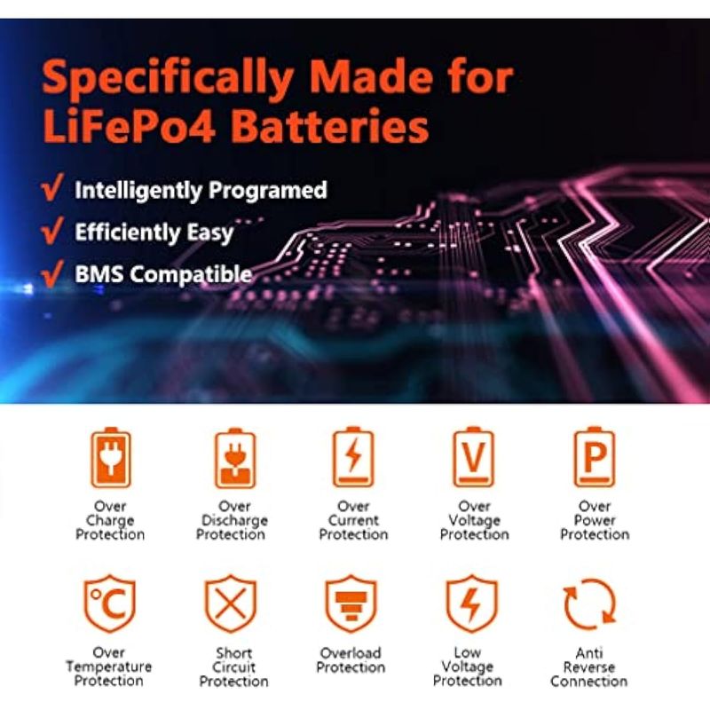 Profesional inteligente: el cargador protege la delicada estructura de tu batería LiFePO4 aumentando la eficiencia de carga y maximizando la vida útil a través de su cuidadosa utilización del algoritmo CCCV, independientemente de si la batería tiene un BMS o no.
