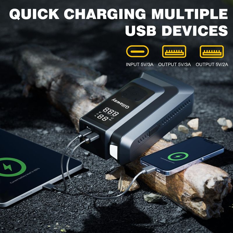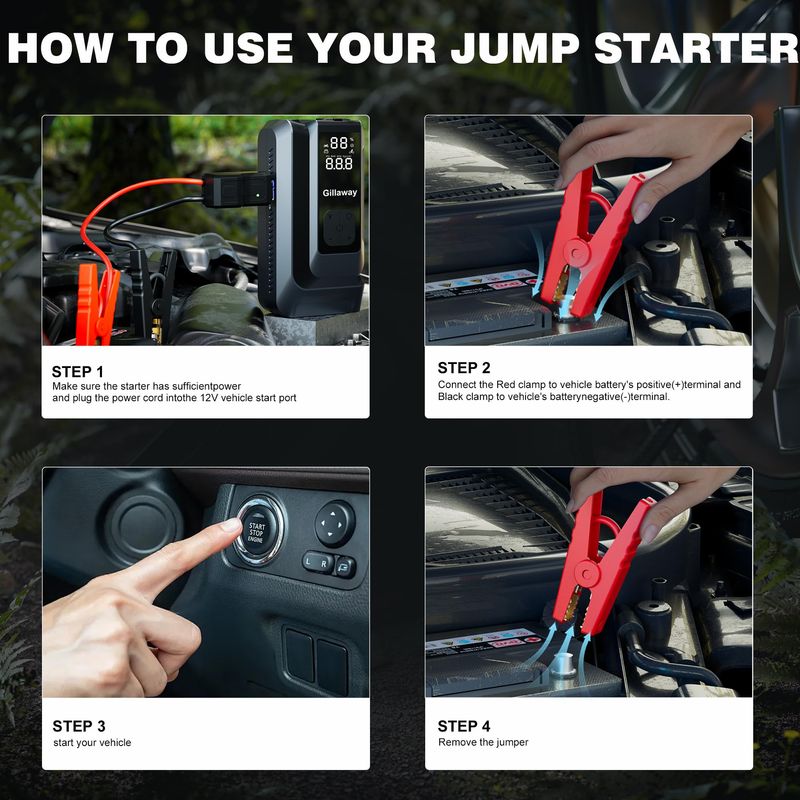 Arrancador portátil 7 en 1 de 6000 A con compresor de aire portátil de 150 PSI, cargador de batería
