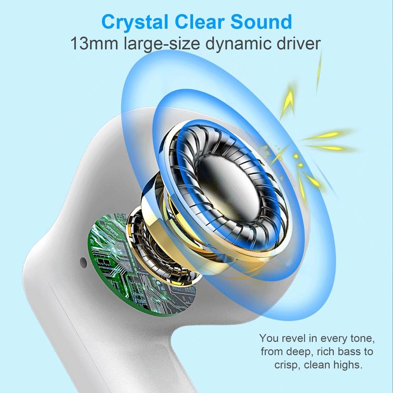 El impresionante sonido estéreo de alta fidelidad y llamada clara: los auriculares inalámbricos cuentan con controladores de 0.512 in que aumentan el sonido de calidad con graves profundos y medios a niveles óptimos que son agradables para los oídos. Te sentirás como un concierto inmersivo. El micrófono integrado en cada auricular Bluetooth utiliza cancelación de ruido de llamada para garantizar un sonido claro y realista. Te permitirá disfrutar de conversaciones de alta calidad en cualquier momento y en cualquier lugar.