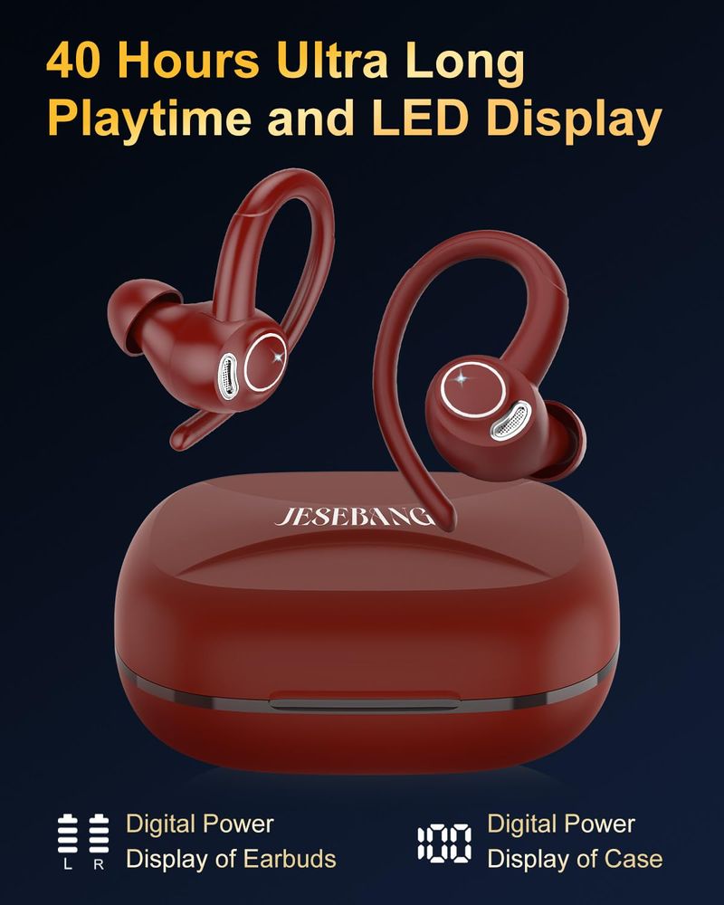 AURICULARES INALáMBRICOS BLUETOOTH 5.3 DEPORTIVOS, AURICULARES INALáMBRICOS 2024 CON GANCHOS PARA LOS OíDOS, GRAVES PROFUNDOS ESTéREO DE ALTA FIDELIDAD CON MICRóFONO ENC, PANTALLA LED DUAL DE 40