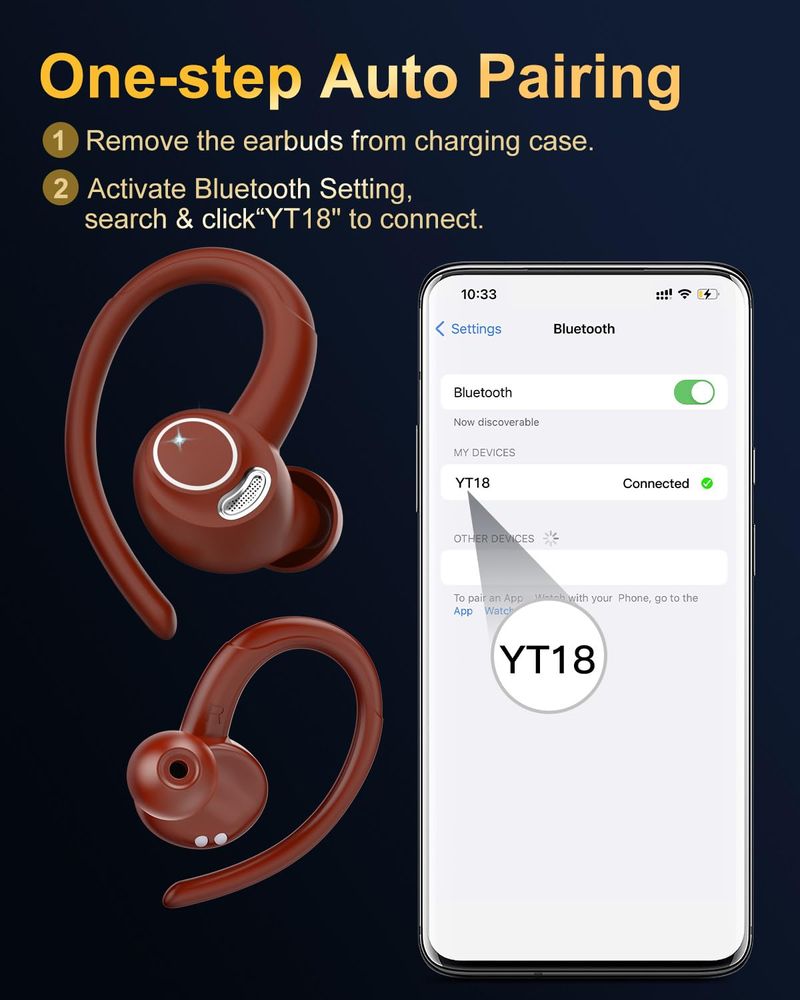 Diseño deportivo ergonómico: los auriculares deportivos cuentan con ganchos para las orejas hechos de un innovador material TPE elástico, el diseño ultraligero y ergonómico le permite usarlos durante mucho tiempo sin sentirse incómodo. Pruebe los tres tamaños de punta para obtener un ajuste cómodo en los auriculares y crear un sello perfecto para un sonido cristalino. Los auriculares inalámbricos Bluetooth son impermeables con un nanorrevestimiento IP7 para protegerlos cuando sudan o se mojan.