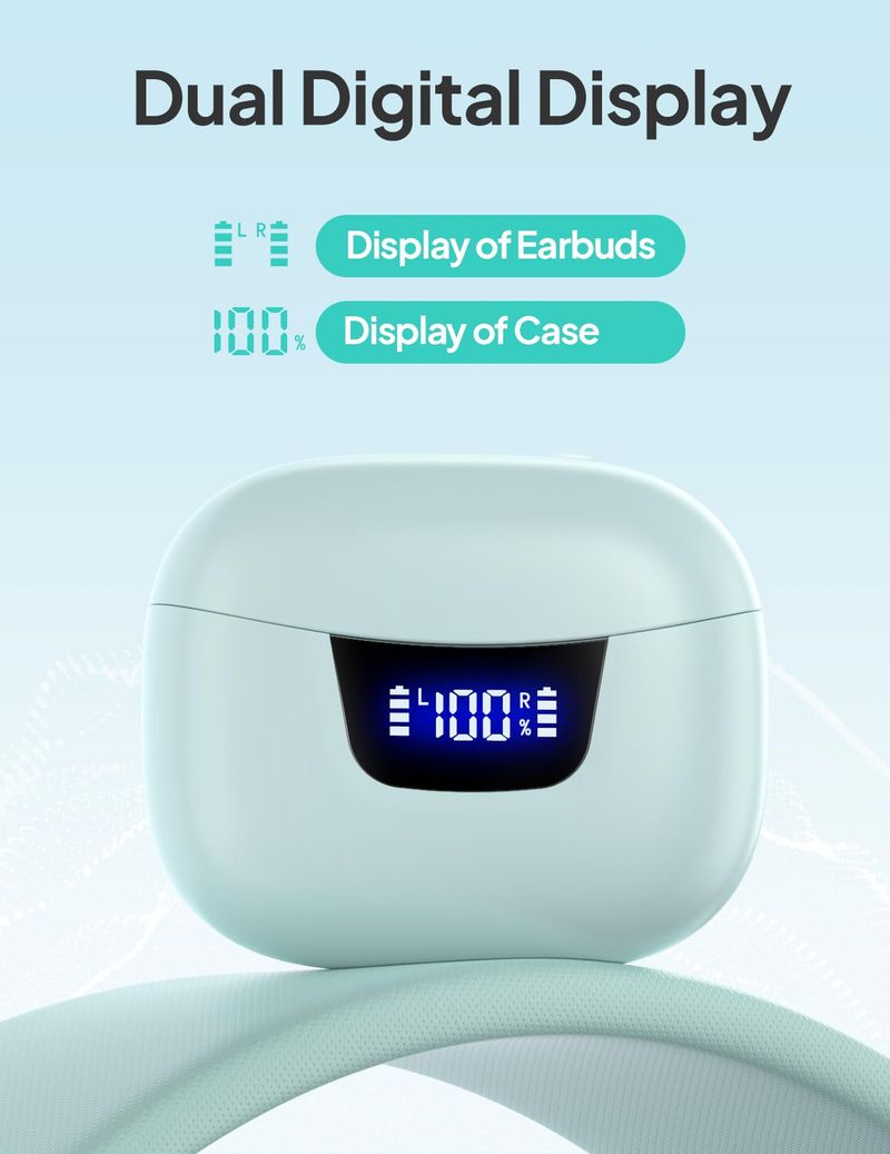 Pantalla de alimentación LED dual: los auriculares Bluetooth tienen una carcasa de pantalla digital dual. La barra de luz LED izquierda y derecha muestra el nivel de batería de los auriculares, y el número medio muestra el nivel de batería de la funda de carga. Te permite mantenerte al tanto del uso de los auriculares y el estuche de carga y cargarlos a tiempo.