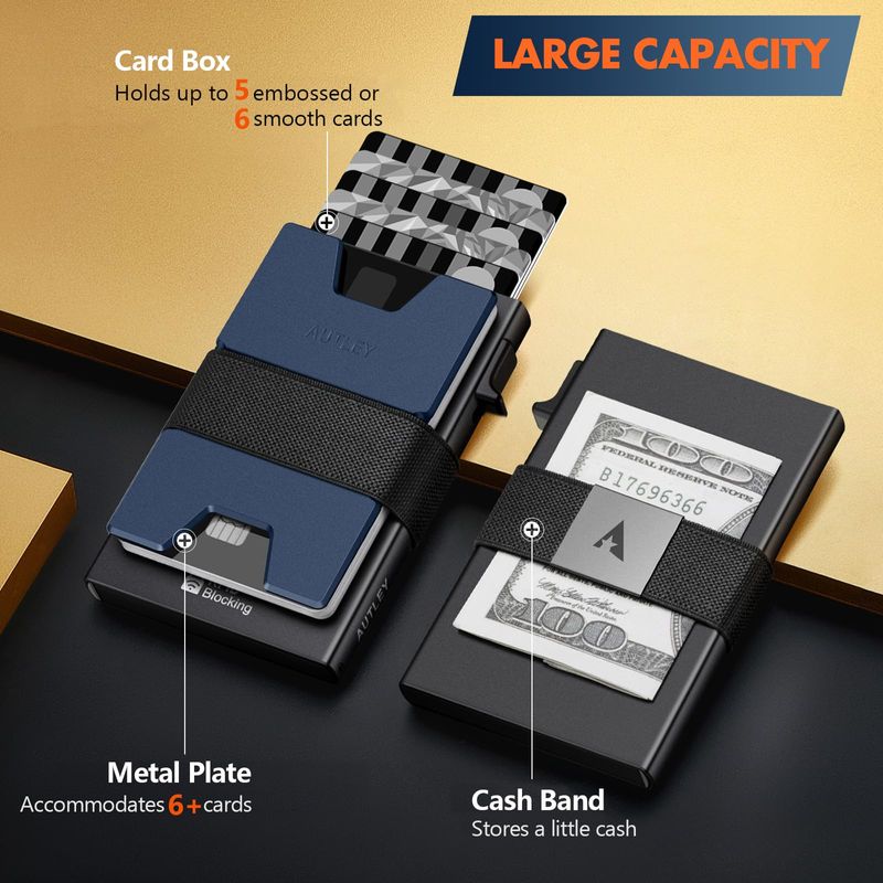 Gran capacidad: la caja de tarjetas bloqueo RFID tiene capacidad para un máximo de 5 tarjetas en relieve6 tarjetas lisas y el compartimento de la placa trasera en el exterior tiene capacidad para más de 6 tarjetas. Total de más de 12 cartas. La banda elástica se adapta a efectivo y recibos.