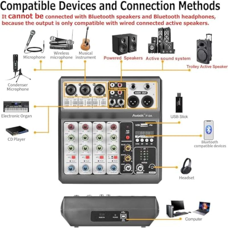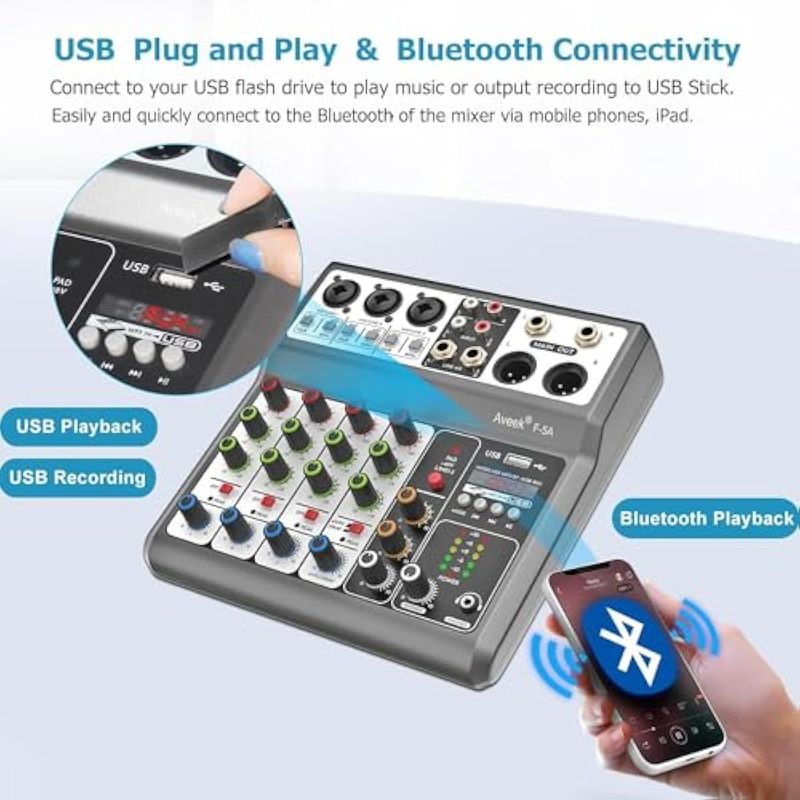 AUDIOConsola DJAveek Mezclador de audio profesional, consola de mezcla de tablero de sonido con 5 canales USB