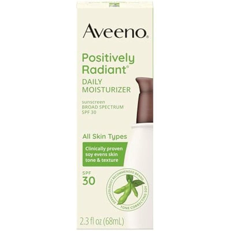 Aveeno La crema hidratante facial diaria positivamente radiante con protector solar SPF 30 de amplio espectro y soja está diseñada para mejorar el brillo natural, reducir el aspecto de las manchas oscuras y mejorar el aspecto del tono y la textura de tu piel. Este humectante facial diario con protector solar contiene soja, que contiene compuestos antioxidantes, así como proteínas, lípidos y carbohidratos que aumentan la luminosidad e iluminan el tono de la piel. Esta fórmula de soja correctora de tono es hipoalergénica, no grasa y no comedogénica, por lo que no obstruye los poros mientras hidrata. Hidratante facial hidratante con amplio espectro SPF 30 está formulado libre de aceite, parabenos, ftalatos, oxibenzona y colorantes. Incluye protector solar SPF 30 de amplio espectro para ayudar a proteger tu piel de más daños solares si se usa según las indicaciones. La crema hidratante facial con protector solar de Aveeno, una marca recomendada por dermatólogos durante más de 70 años, está clínicamente probada para igualar el tono y la textura de la piel en solo cuatro semanas mientras combate los signos del envejecimiento temprano de la piel.