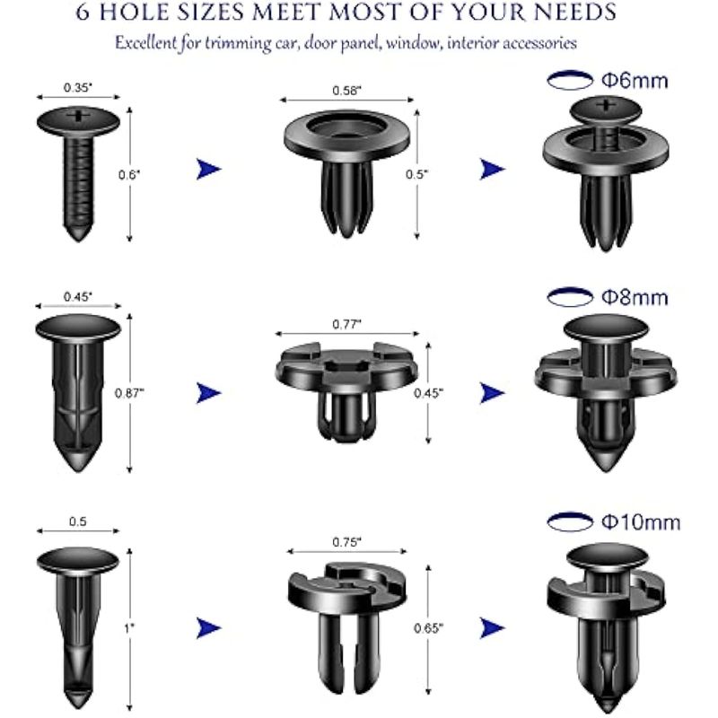 Remaches de plástico: el paquete contiene 30 clips de 0.236 pulgadas, 30 clips de 0.276 pulgadas, 30 clips de 0.315 pulgadas, 50 clips de 0.315 pulgadas, 30 clips de 0.394 pulgadas, 30 clips de 0.394 pulgadas.