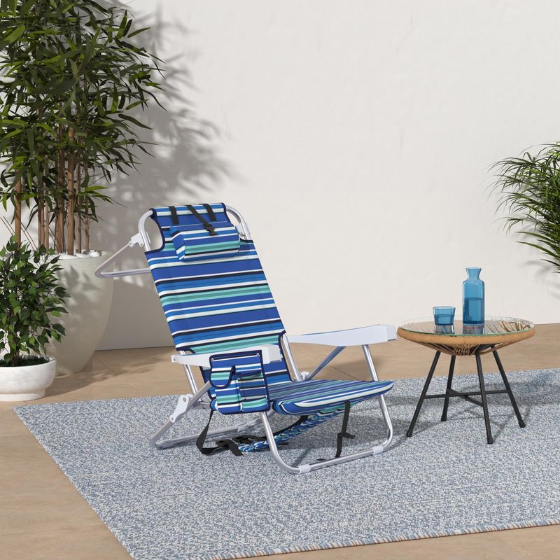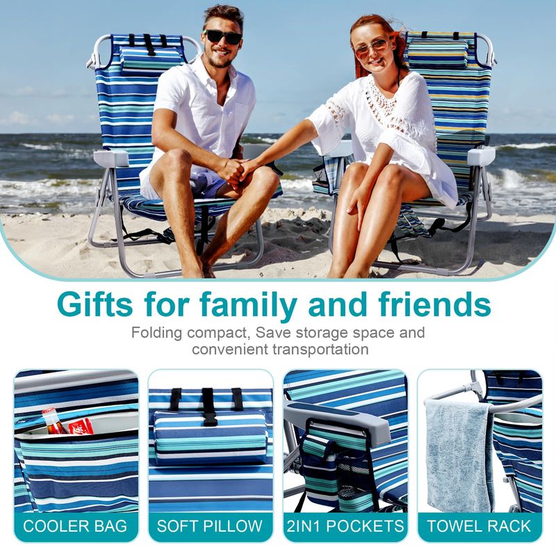 BACKPACK BEACH CHAIR FOR ADULTS, FOLDING BEACH CHAIR WITH 4 POSITIONS, HEAVY DUTY BEACH CHAIR WITH LARGE COOLER POUCH SUPPORT TO 350LBS (STRIPES_BLUE&CYAN&YELLOW)