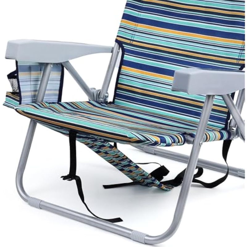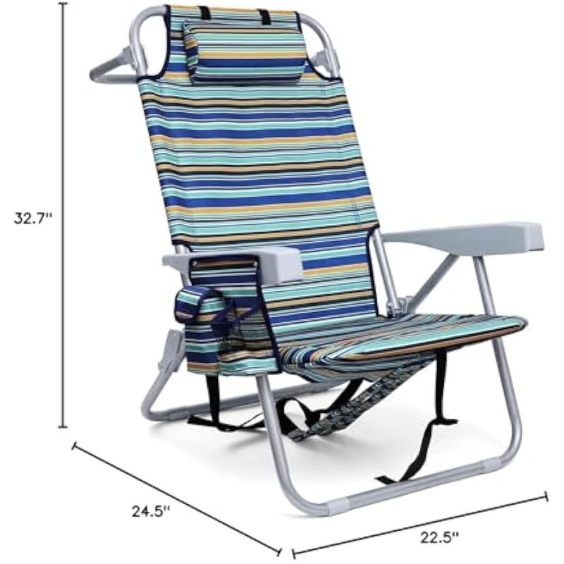 BACKPACK BEACH CHAIR FOR ADULTS, FOLDING BEACH CHAIR WITH 4 POSITIONS, HEAVY DUTY BEACH CHAIR WITH LARGE COOLER POUCH SUPPORT TO 350LBS (STRIPES_BLUE&CYAN&YELLOW)