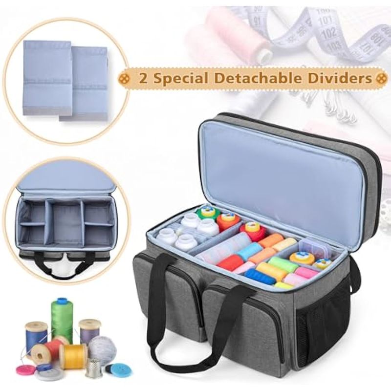 Capa inferior: la sección inferior con 2 separadores especiales desmontables para organizar los carretes de hilo. Esta parte es lo suficientemente profunda para almacenar algunos kits de costura más grandes.