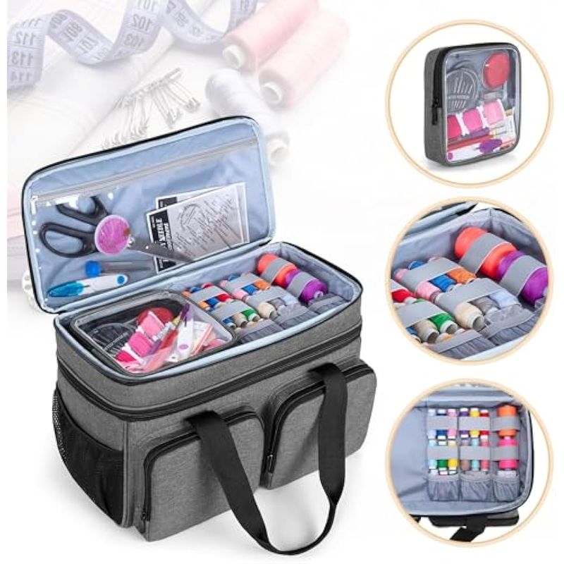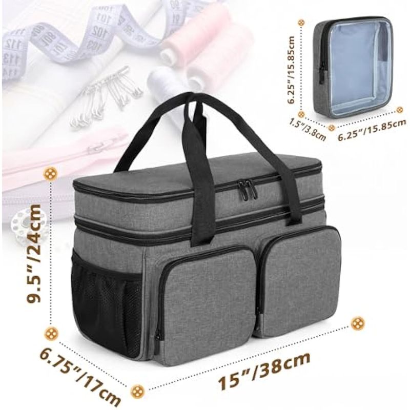 Fácil de transportar: asas superiores resistentes para un fácil transporte. Tamaño de la bolsa: 15" x 6.75" x 9.5". Tamaño de la bolsa transparente: 6.25" x 6.25" x 1.5". Lo suficientemente grande como para sostener todas las herramientas de costura.