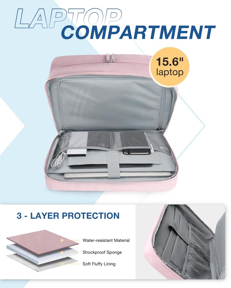 2 zonas de almacenamiento: zona de estilo de vida: espacio amplio con 1 bolsillo impermeable, 1 bolsa para zapatos. Zona de negocios: 1 compartimento acolchado para laptop de 15.6 pulgadas, 1 bolsillo dedicado para tablet de 10.5 pulgadas, una sección de archivos y múltiples compartimentos para accesorios.
